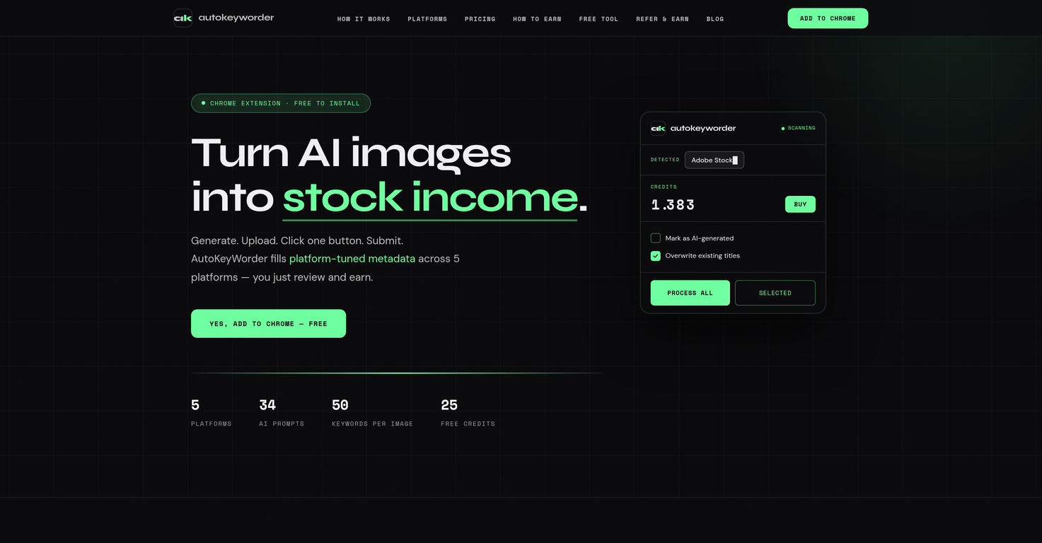 Autokeyworder is a tool designed for AI creators, automating the process of generating and uploading AI images on stock platforms to create a passive income stream. It specifically targets the quality of metadata, providing inputs that are tailored to each individual platforms search algorithm instead of relying on generic tags or keywords. Autokeyworder uses specific prompts to optimise titles, keywords, and categories thus enhancing the discoverability of the AI images across platforms such as Adobe Stock, Shutterstock, Zedge, Displate and TeePublic. The entire workflow is browser-based and simple: generate images using any AI tool, upload them, click a single button for Autokeyworder to fill in the metadata, review, submit, and earn. Besides, the browser extension automatically detects supported platforms' upload pages, making the process even smoother. Autokeyworder also continues to extend its metadata support to more platforms, meticulously aligning its functions to match the platform's algorithm, keyword counts, and rules. The tool is free to install as a Chrome extension.