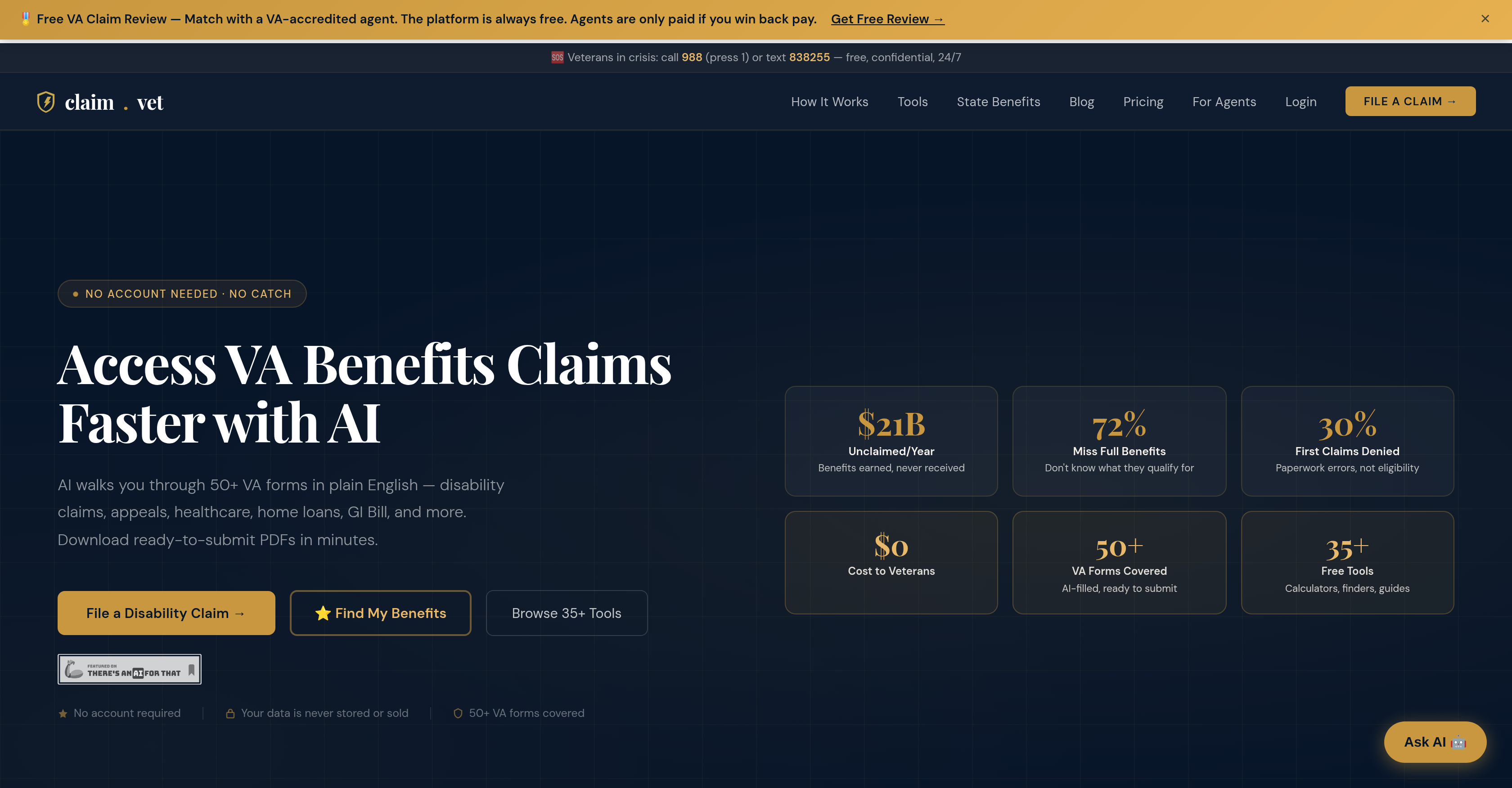 Claim.vet is an AI Benefit Navigator specifically designed for U.S.