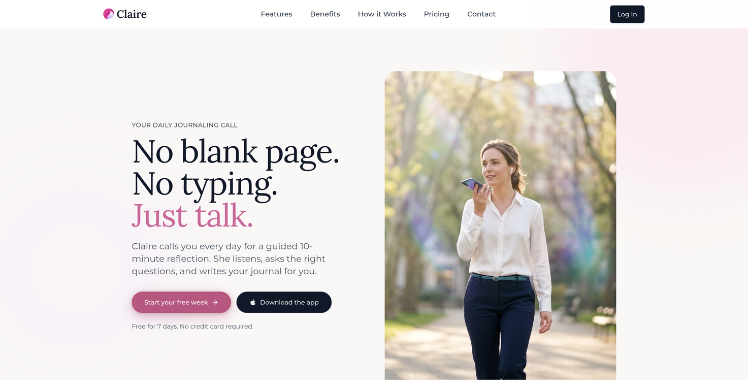Claire is a voice journaling application specifically designed for daily reflection and emotional check-ins. This innovative tool focuses on the convenience and consistency of journaling by transcending traditional constraints of typing or writing by hand. As opposed to having to stare at a blank page or find quiet spaces for self-reflection, Claire reaches out to users via scheduled phone calls, guiding them through a 10-minute conversation where emotions, ideas, and thoughts can be freely expressed. Listen, ask and respond, Claire documents these interactions in the form of private journal entries. These entries not only provide users with a record of their reflections, but also deliver mood insights and gratitude highlights, enabling users to track personal growth over time. The application strives to circumvent typical issues faced while maintaining regular journaling habits such as potential guilt from missed days. The ultimate aim of the Claire application is to provide a simple, unobtrusive way to foster clarity and emotional resilience in daily life.