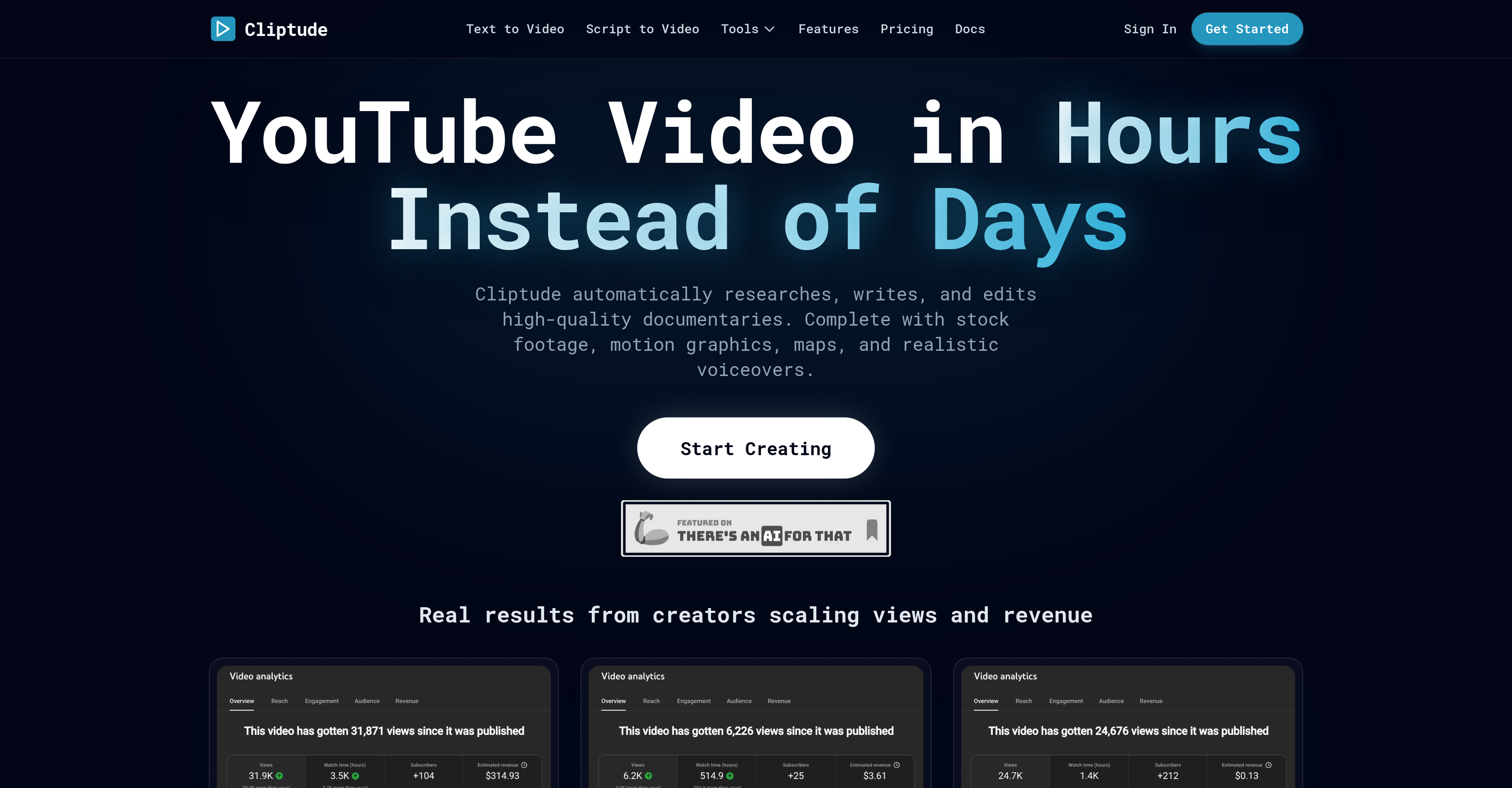 Cliptude is an AI-powered tool designed to convert ideas or scripts into video content. Its core functionality revolves around automatic generation of voiceovers, visuals, and final cut editing, creating a polished, ready-to-publish video. A notable feature of Cliptude is its ability to generate high-quality documentaries autonomously, complete with necessary embellishments like stock footage, motion graphics, and maps enhanced with realistic voiceovers. The platform does the heavy lifting - from researching and scripting to complex motion graphics design, which streamlines the production flow for creators. It is designed to understand the context of a described topic, create a well-researched script, source appropriate stock footage, and align everything up to a professional beat. Additionally, Cliptude also offers smart data visualization, converting the data in your script into maps, flight paths, timelines, or counters. Users maintain complete ownership rights to the videos they create via Cliptude, with the flexibility to download and use them across platforms like YouTube, TikTok, or Instagram. The tool operates on a usage-based pricing model, with charges based on the length of the generated video.