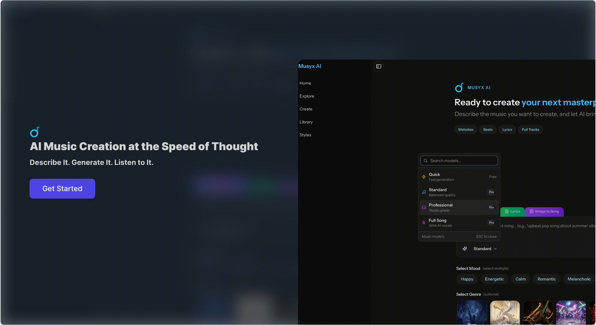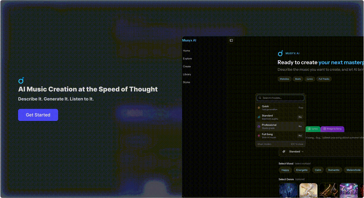Musyx AI is a versatile AI-powered tool made to facilitate music creation. With its state-of-the-art technology, users can describe their ideas in text format or upload an image, and the AI system composes a track that captures the essence of the described mood or concept.