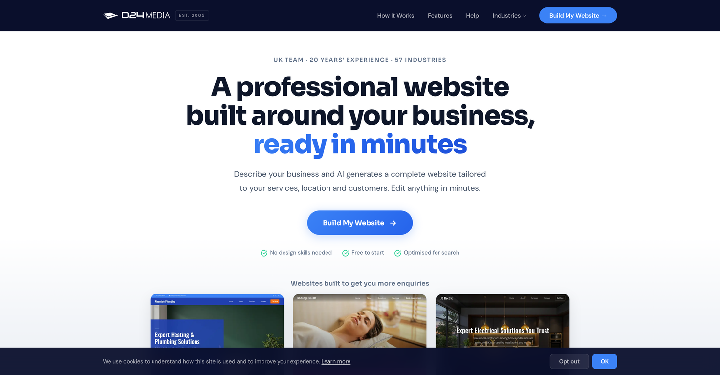 D24 Media AI Website Builder is an AI-powered tool designed to assist small businesses across a wide array of industries in creating professional websites. The tool utilizes artificial intelligence to generate websites tailored to a business's services, clients and location. Users simply describe their business, and the AI generates a complete website, which can be tweaked and edited within minutes. It features a user-friendly interface, requiring no design skills, making it easy for businesses to get online without needing to engage with designers or cope with lengthy wait times. Importantly, the tool is structured to encourage customer engagement, with clear calls-to-action, contact sections and built-in service pages designed to turn visitors into inquiries. The AI website builder also offers full control over the website's content and design, enabling businesses to make website updates at their convenience. This includes changing text, swapping images, adding services or activating and deactivating sections. Furthermore, the AI website builder prioritizes search engine optimization, establishing solid SEO foundations to enhance visibility on search engines like Google. It also includes features such as mobile-friendly design, built-in lead forms, copywriting services and secure hosting. D24 Media's AI Website Builder is tailored to various industries, allowing a high degree of customization based on the unique needs and nature of each business sector. Additionally, ongoing support from a UK-based team is available to provide help as needed.