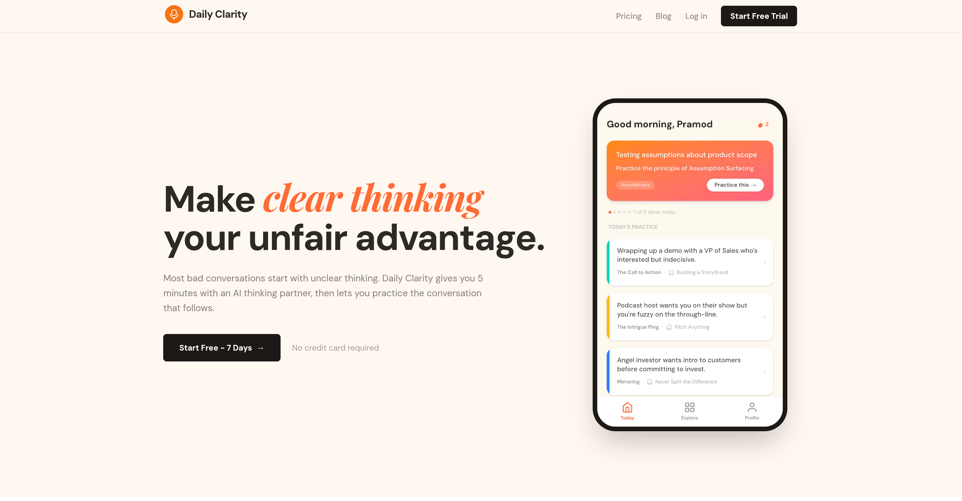 Daily Clarity is an AI-enhanced tool designed to facilitate clear and impactful communication. Central to its functionality is a daily five-minute session with an AI thinking partner, aimed at refining clarity of thought before conversations take place.