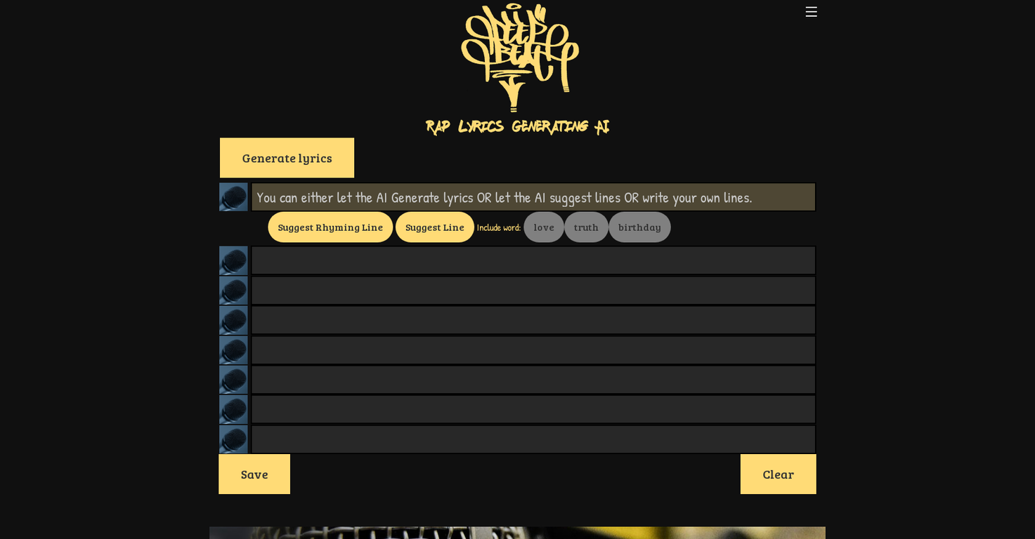The tool includes keywords, such as "birthday" and "truth," that can be added to the lyrics to generate more personalized and relevant content. Users can choose to generate entire lyrics automatically or add lines manually using "Suggest (Rhyming) Line" buttons or writing lines themselves.