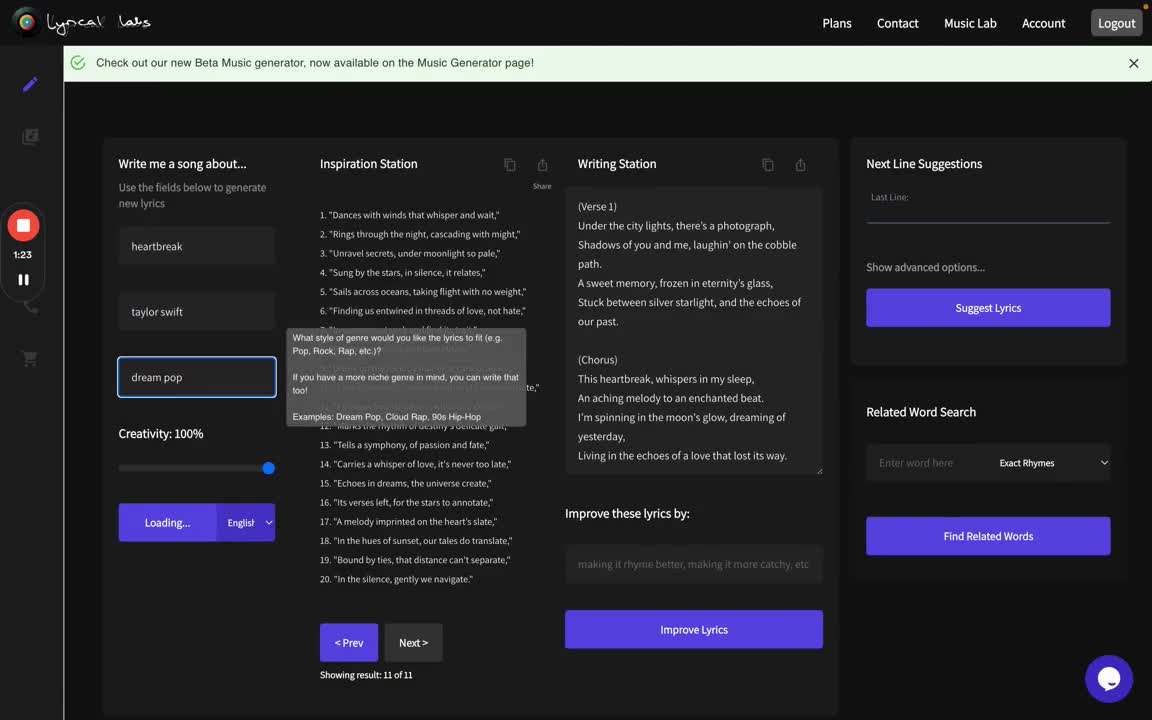 DeepBeat is an AI program that generates rap lyrics using machine learning techniques. It combines lines from existing rap songs, trying to match rhyming lines and ensure the lyrics make sense together. The tool includes keywords, such as "birthday" and "truth," that can be added to the lyrics to generate more personalized and relevant content. Users can choose to generate entire lyrics automatically or add lines manually using "Suggest (Rhyming) Line" buttons or writing lines themselves. The tool also allows users to edit settings and add keywords through the upper-right corner of the interface. DeepBeat was created by Eric Malmi, Stephen Fenech, and Pyry Takala and has been featured in several media outlets, including Bloomberg, the Wall Street Journal, and Mashable. The tool's source code is available on GitHub, and the team accepts feedback from users via email. DeepBeat's lyrics, generated from its algorithms, can be used for artistic or entertainment purposes.