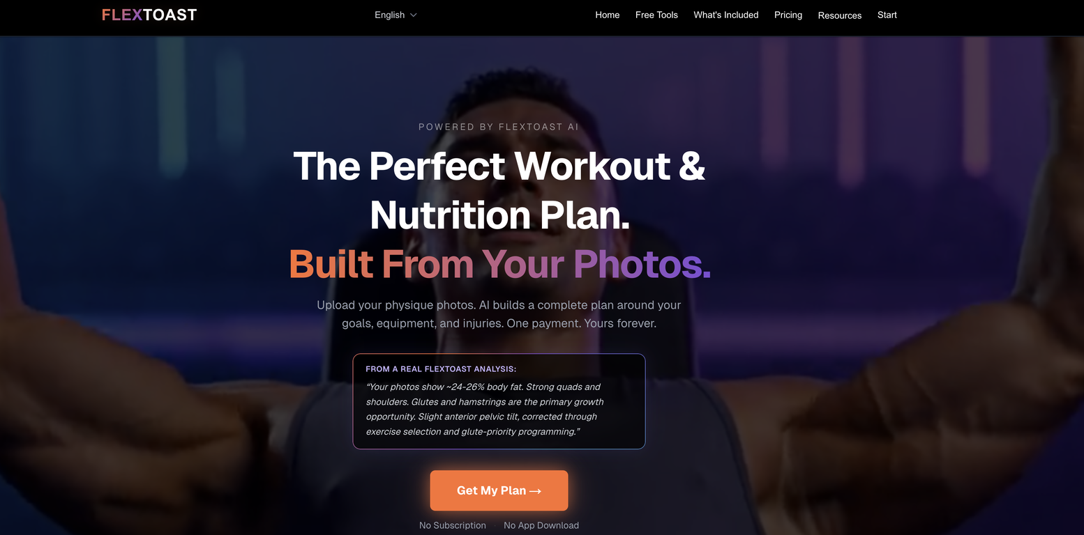 FlexToast is an AI-powered fitness tool offering personalized workout and nutrition plans based on photos provided by the user. On uploading the photos, the tool analyzes physique, estimating body fat percentage, and identifying muscle imbalances, postural issues, and key growth areas.