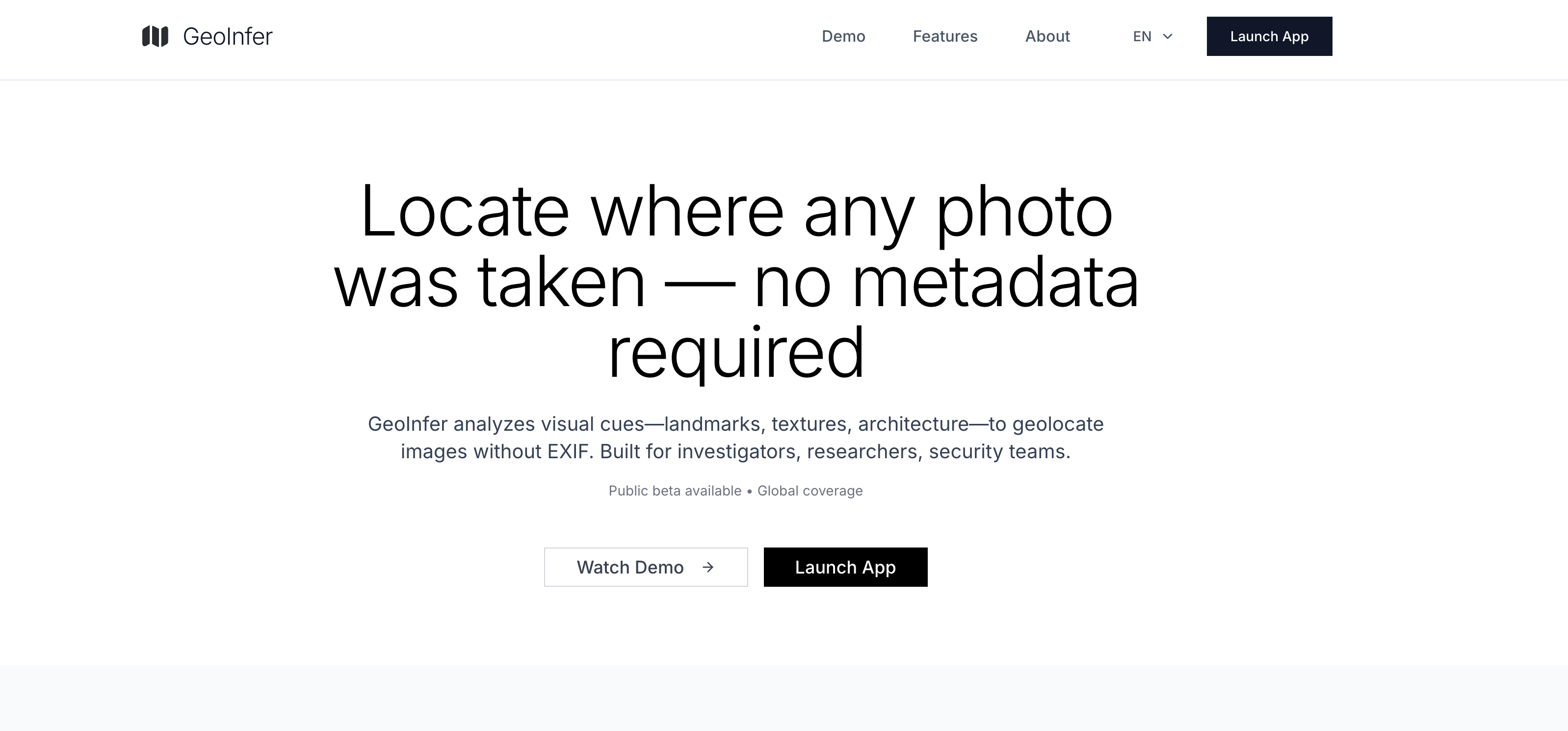 GeoInfer is an AI-powered image geolocation platform developed specifically for investigators, researchers, law enforcement, journalists, and security professionals. It processes and analyzes visual cues such as architecture, terrain, vegetation, and environmental markers within photos to identify the geographical location where the photo was taken. This AI system works even in the absence of EXIF or GPS data from metadata, making it highly reliable for images that come from sources like social media or messaging apps where metadata may be stripped.The platform relies on deep learning models that are trained on millions of geotagged images to enable precise location detection from any photo worldwide. Its comprehensive database covers urban centers, natural landscapes, and remote locations, leading to accurate photo location detection.GeoInfer's real-time processing capabilities enable seamless integration into professional workflows and provide subsecond AI image search processing. The platform can find location from image files even when GPS data has been removed or was never present, analysing visual content rather than embedded location data.GeoInfer offers wide coverage as it is trained on data from every continent, giving it the ability to accurately analyze photos taken anywhere in the world. However, accuracy may vary depending on the density of reference imagery in the platforms training data. Urban areas and popular locations generally yield higher precision results.GeoInfer serves several professional use cases like verifying locations in open-source intelligence gathering and threat assessment, authenticating and geolocating evidence in legal and investigative contexts, and analyzing and verifying visual content for security and compliance purposes.