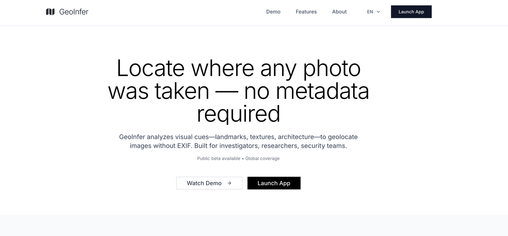 The platform can find location from image files even when GPS data has been removed or was never present, analysing visual content rather than embedded location data.GeoInfer offers wide coverage as it is trained on data from every continent, giving it the ability to accurately analyze photos taken anywhere in the world.