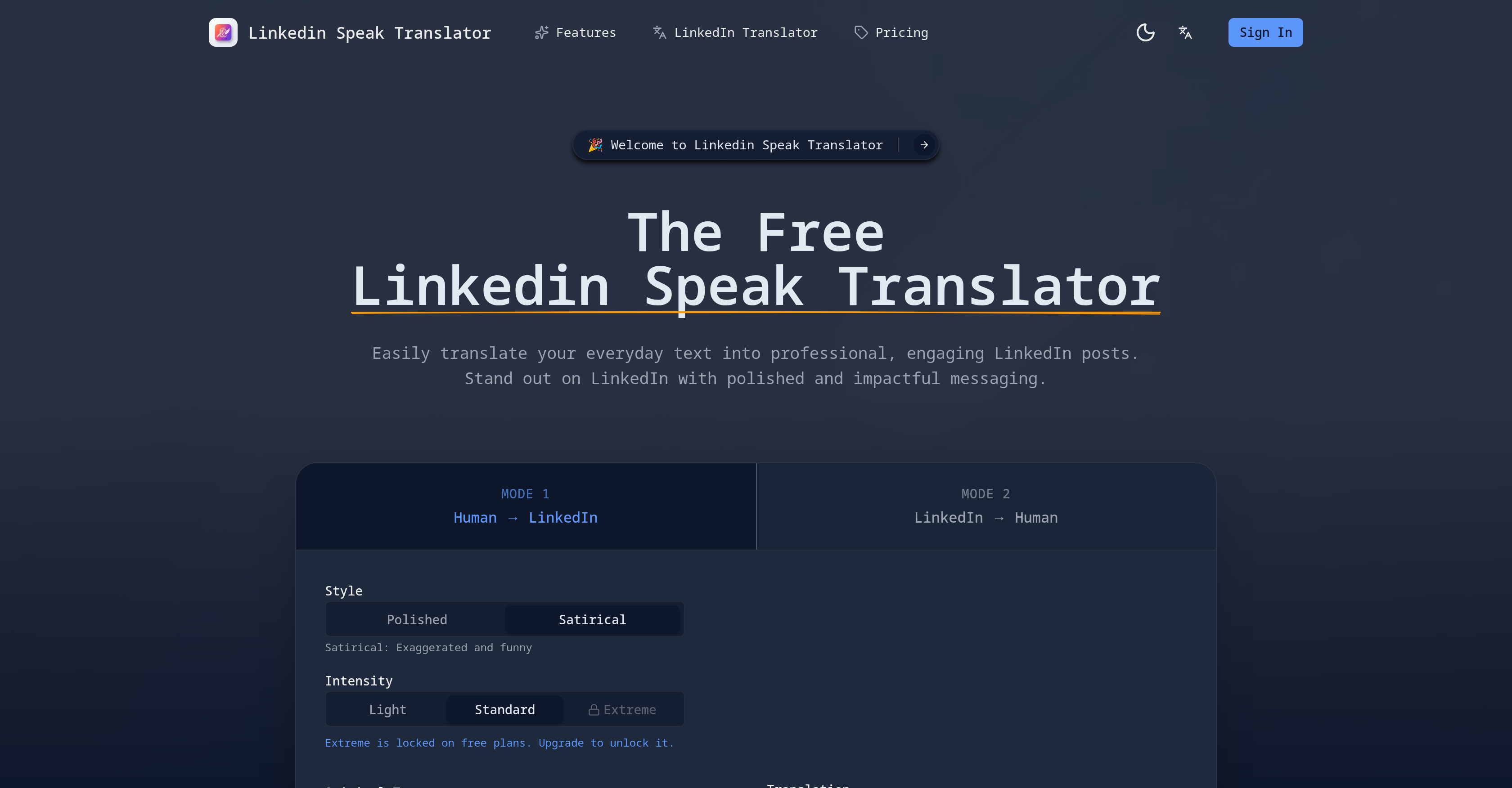 LinkedIn Speak Translator is equipped with a dual direction feature that can translate plain English to corporate jargon and vice versa. It also offers an intensity control feature that allows the users to modify the business tone from subtle professional touches to extreme corporate linguistics.
