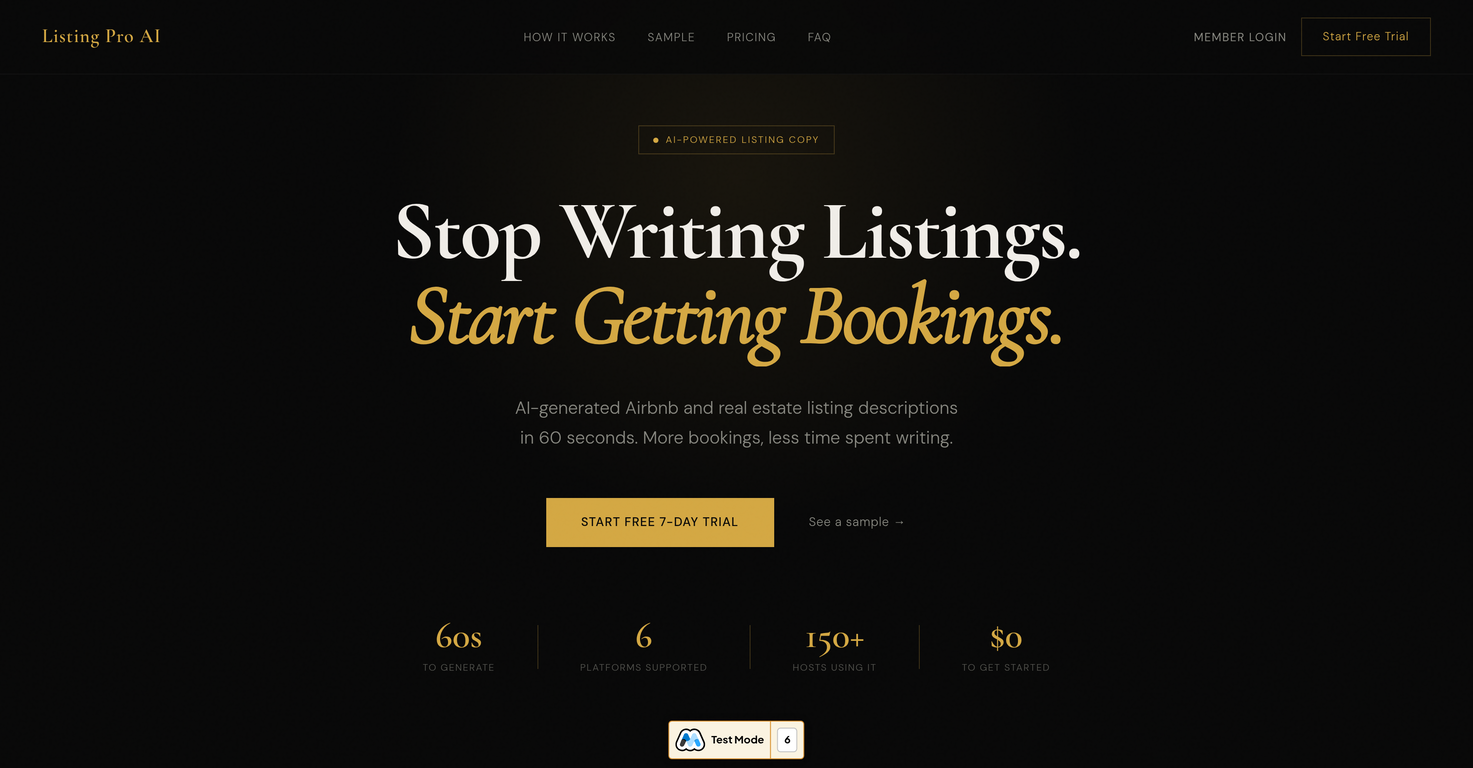 Listing Pro AI is an AI-powered tool designed to streamline the creation of property listings for platforms such as Airbnb, VRBO, MLS, and others. Instead of manually writing property descriptions, users can rely on AI-generated content that's hooked in 60 seconds. The tool requires brief inputs such as property features, location, and the target audience to generate SEO-optimized, professional listing descriptions. This service aims to save hosts' time and increase property bookings. It's user-friendly, after receiving the generated description, users simply copy and paste the text to their chosen platform. Apart from saving time, the listings are intended to convert potential guests better, thanks to precise SEO use and experiential narrative. The AI-output is fully editable, allowing for any necessary adjustments. To facilitate ease of use, Listing Pro AI offers a straightforward three-step process: 1) Users fill in property details, 2) AI generates the listing, and 3) Users copy, paste and await bookings. The service offers different subscription plans, each caters to different usage scales from individual hosts to agencies, and every plan begins with a 7-day free trial.