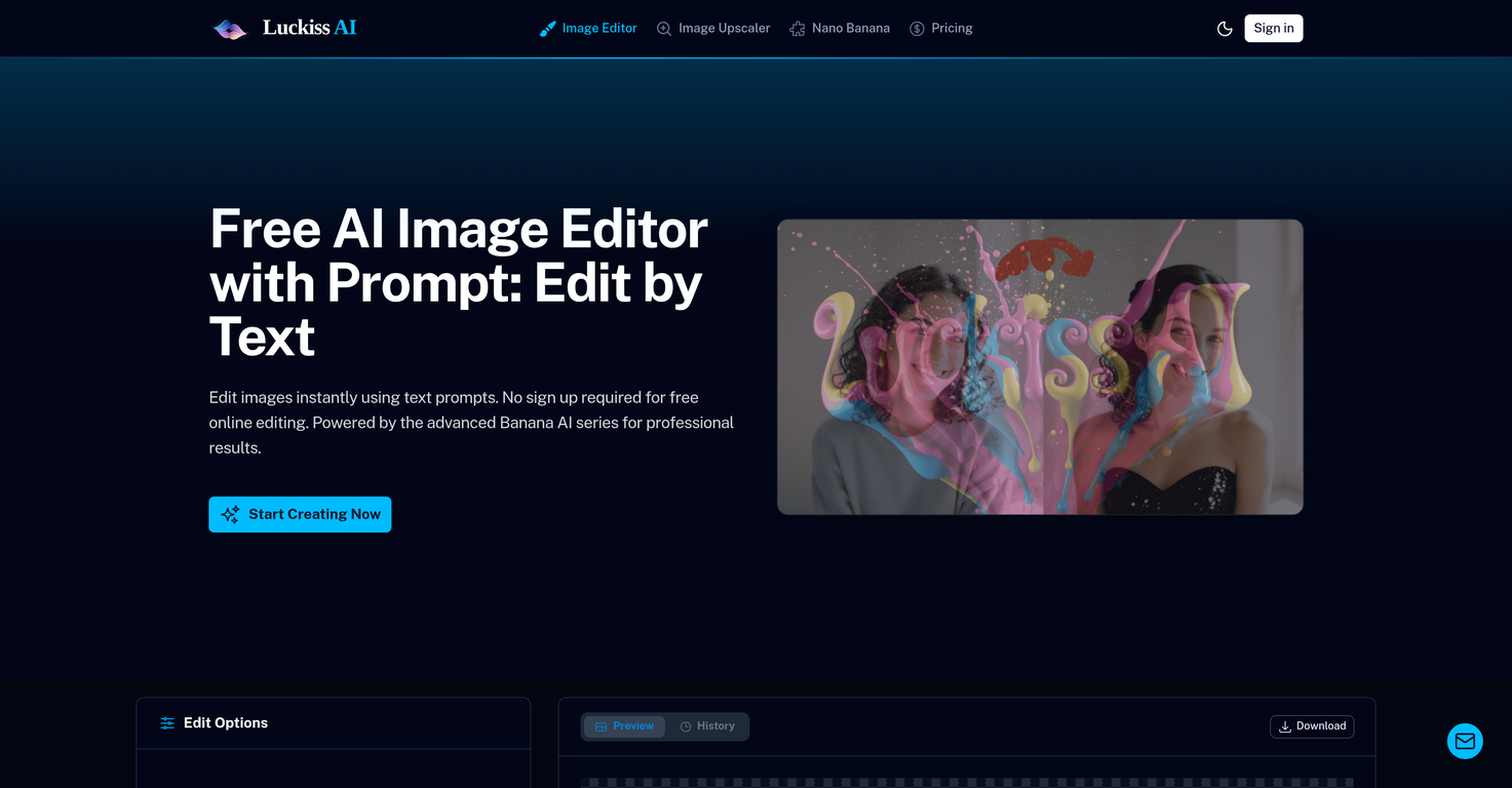 The Luckiss AI Image Editor is a robust and user-friendly AI tool designed to simplify photo editing through the power of AI prompts. It requires no sign-up, providing immediate access to free online editing.