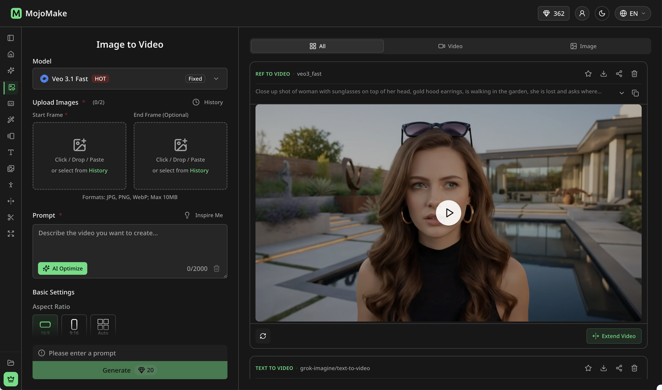 Overview Socials: You have an idea for a video. Maybe a product spin for your Shopify store. Or a Ghibli-style clip for TikTok. Or a title card for your YouTube intro. Different ideas need different AI models, and right now each model comes with its own subscription. MojoMake is one account for all of it. Veo, Kling, Seedance, Wan, Grok Imagine for video. Nano Banana, Flux, Seedream, GPT Image, Qwen for images. Official APIs, not copies. Switch between them with one click, same output quality, one bill. Type a prompt. Upload an image to animate. Make a character appear in different scenes with the same face and outfit. Or pick one of 100+ ready-made effects like AI Hug, Ghibli Me, Product Spin, and Earth Zoom. 12 creation tools total: text-to-video, image-to-video, mimic motion, and background removal. You keep the commercial rights. No watermarks. 1080p video, 4K images. 10 free credits on signup, no card. Enough to make 2 videos or 10 images. Key Features All Top Ai Models In One Account (veo, Kling, Seedance, Grok, Flux) Replaces 4-5 Separate Ai Subscriptions 100+ Ready-made Video Effects (ai Hug, Ghibli Me, Product Spin) Text-to-video Generation Image-to-video Generation Reference-to-video (character Consistency) Mimic Motion Video Extension Background Removal Image-to-image Editing 100% Commercial Rights, No Watermarks 4k Image / 1080p Video Export Free Credits On Signup, No Credit Card 7 Language Support (en, Zh, Ja, Es, Pt, Fr, De) Show more