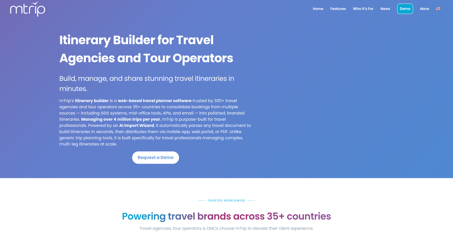 mTrip is a web-based traveler itinerary and travel planner software optimized for travel agencies and tour operators. The tool is designed to consolidate bookings from multiple sources, be it from GDS systems, mid-office tools, APIs, or emails, into refined, branded itineraries.