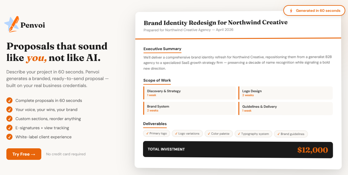 Overview The only AI proposal generator that uses your real credentials — never invented ones. Penvoi writes complete client proposals in 60 seconds. Set up your Brand Profile once with your real specialties, founded year, voice, and client outcomes — then every proposal pulls from those facts. No fake "industry-leading" boilerplate. No invented client counts. No hallucinated statistics. Built for freelancers and small agencies who'd rather do great work than write about it. What you get: ✓ Complete proposals in 60 seconds ✓ AI uses YOUR real credentials, never invents them ✓ Custom sections (Case Study, Assumptions, Out of Scope) — add, reorder, hide anything ✓ Improve any section with one click (More formal / concise / confident) ✓ White-label client experience on paid plans (your logo, your colors, no Penvoi branding) ✓ Built-in e-signatures, view tracking, edit lock, revision history ✓ Free tier: 1 proposal/month, no credit card required Paid plans start at $19/mo. First proposal is always free. Show more