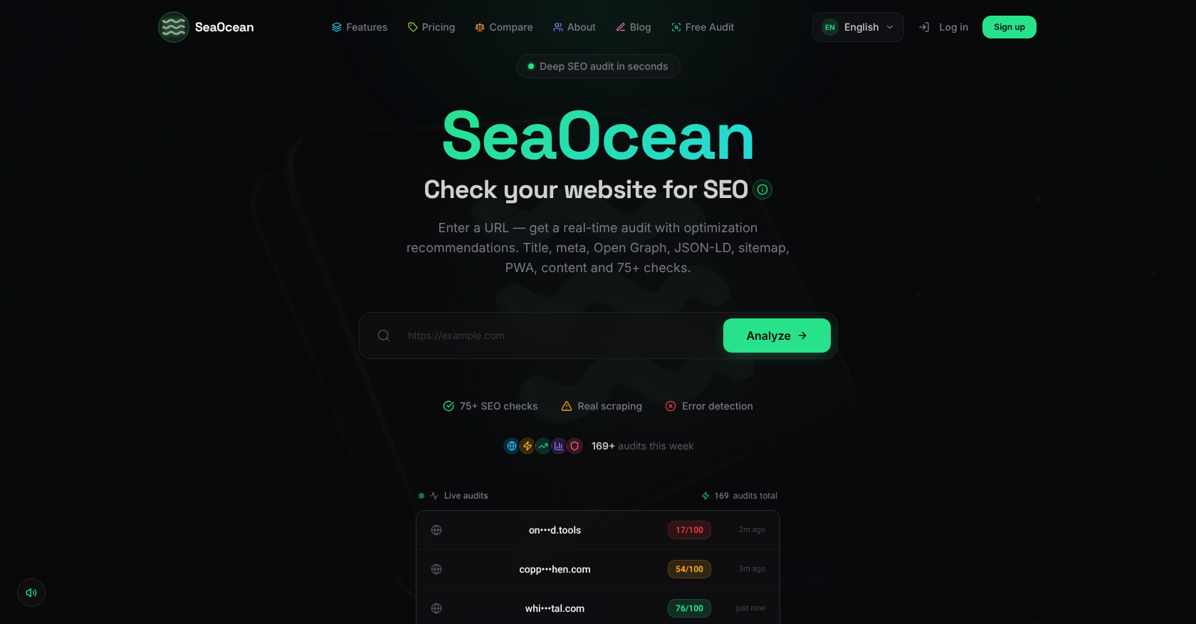 Overview Socials: SeaOcean is a free AI-powered SEO audit tool that analyzes any website with 75+ checks in under 30 seconds. Key features: - Technical SEO audit (meta tags, headings, schema markup, sitemap, robots.txt) - Core Web Vitals monitoring (LCP, INP, CLS, FCP, TTFB) - AI Fix Guide with ready-to-use code snippets for every issue - LLM AI Search Optimization — check visibility in ChatGPT, Perplexity, Claude - Keyword opportunity detection with search volume - PDF reports for clients - Site comparison tool - 11 languages supported No signup required for free audits. Built for freelancers, agencies, and startups who want Semrush-level insights without the $100+/month price tag. Key Features Ai Fix Guide Core Web Vitals Monitoring Keyword Rank Tracking Site Comparison White-label Reports Multi-language Support Llm Visibility Check Og Image Generator Favicon Generator Show more