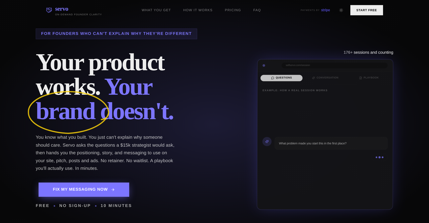 It aims to assist these users in clearly explaining their business by articulating who they serve, what problems they solve, and how they stand out from their competitors.Servo offers several actionable insights to help users understand common brand strategy questions.
