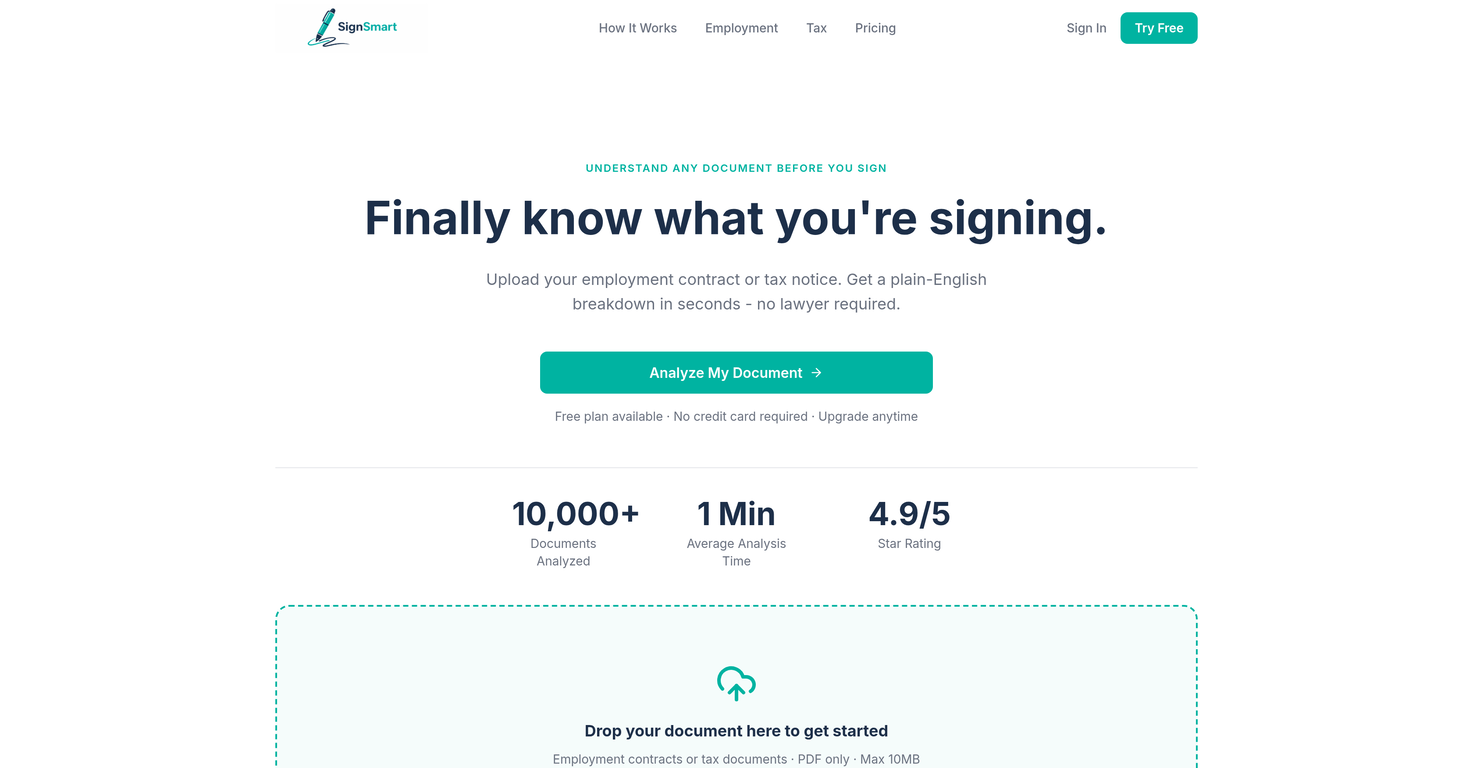 SignSmart is an AI tool designed to facilitate the understanding of complex documents, thus empowering users to fully comprehend their contents before they sign. The tool primarily focuses on employment contracts and IRS notices. To use SignSmart, users simply upload the document they wish to understand. The tool then utilizes artificial intelligence technology to analyze the document and provide a plain English breakdown of its contents. The output enables users to better comprehend the technical language and terminologies typically found in these documents. This simplifies the decision-making process as it allows users to quickly understand the implications of what they are signing. The information is delivered in a user-friendly and easily comprehensible manner, thus bridging the gap between technical jargon and layman's terms. SignSmart's primary goal is to bring clarity and transparency to the process of signing important documents, making it an essential tool for individuals who routinely deal with complex contracts or notices.