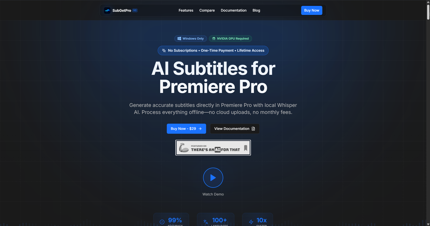 SubGetPro is an AI-powered subtitling tool designed for Adobe Premiere Pro. It allows users to generate precise subtitles through a process which is entirely handled offline, ensuring privacy and security concerns are met. As an alternative to tools like Firecut, AutoPod, and Descript, SubGetPro provides a broad scope of functionality, including one-click transcription, silence detection, a full-featured SRT editor, and customization of captions with the help of Motion Graphics templates. It also includes support for right-to-left (RTL) languages such as Arabic, Persian, and Urdu, among 100+ other languages. OpenAI's Whisper AI is utilized in the transcription process, giving the product a high rate of accuracy. The tool's other significant features include real-time track scanning, drag and drop editing for easier subtitle manipulation, timeline-based direct subtitle import, GPU acceleration for faster processing, and a customizable settings panel to fine tune user workflow. Importantly, the tool is structured to work even after the initial setup without needing internet connectivity. Lastly, its straightforward workflow makes is accessible to fresh and experienced users alike, requiring minimal learning curve.