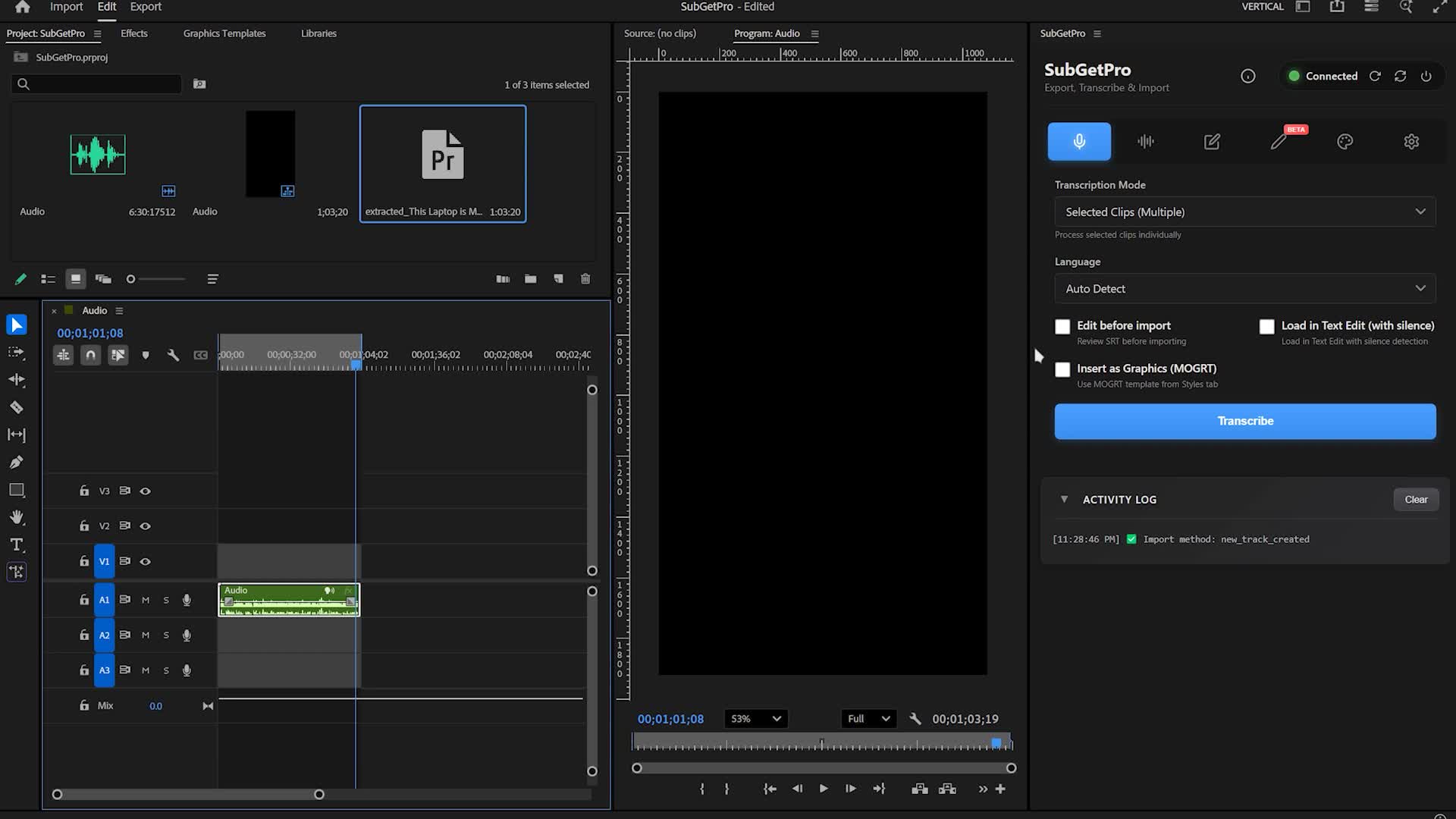 As an alternative to tools like Firecut, AutoPod, and Descript, SubGetPro provides a broad scope of functionality, including one-click transcription, silence detection, a full-featured SRT editor, and customization of captions with the help of Motion Graphics templates.