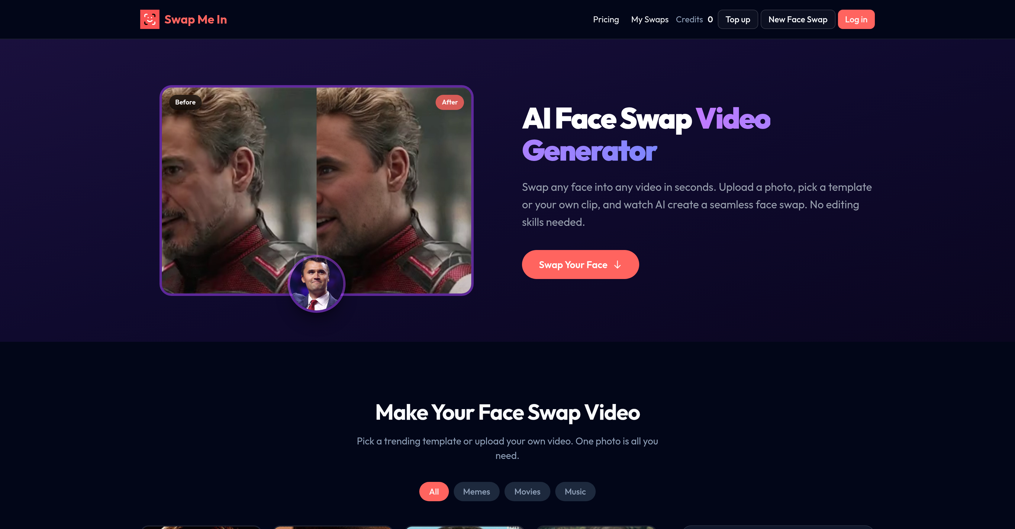 Swap Me In is a face-swapping tool which uses Artificial Intelligence to intelligently replace faces in video content. This tool is intended to provide a seamless face swap experience with minimal user input and no requirement for editing skills. Utilization includes uploading a clear face photo, choosing a template or uploading a personal video. It supports images in JPG, PNG, and WebP formats, and is compatible with video files in MP4, MOV, and WebM. The tool also includes a multi-face swap feature which allows users to replace up to five different faces in a single video. The platform maintains user privacy, as uploaded photos and generated videos are automatically deleted after processing, ensuring user content is not stored longer than necessary. The processing time is generally short with most videos being processed in less than a minute. Payments are made on a per-second basis, and users only pay for what they use. For new users, there are free starter credits available to try out the service.