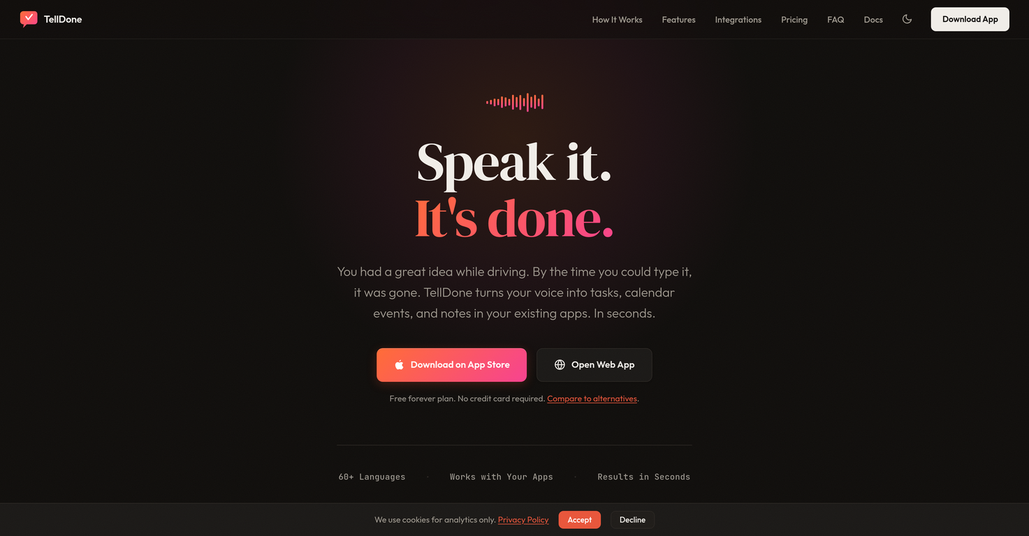 TellDone is a voice-first planning application designed to transcribe voice notes and convert them into tasks, structured notes, calendar events, and reminders using AI. By eliminating the need for manual text input, TellDone facilitates a faster, more streamlined planning process. With support for over 60 languages, the application demonstrates versatility and global accessibility. TellDone is compatible with multiple platforms including iPhone, Apple Watch, and web interfaces, and also integrates with various popular productivity apps such as Apple Calendar, Todoist, Notion, Things 3, among others. It further augments its utility with features like email forwarding, webhooks, and an API. The application uses AI technology to analyze the intent from voice input and create structured output in seconds. Its 'Smart Context' feature enables it to understand and mark the completion of tasks automatically. In addition, a function for creating auto-achievements is incorporated that tracks and creates completed tasks automatically. Privacy is a priority for TellDone, with GDPR compliance ensured, and an on-device transcription option available for enhanced data security. The voice-to-task solution embraces a voice or text option, an auto-tagging feature, semantic search, offline work mode, and daily reports fostering enhanced productivity.