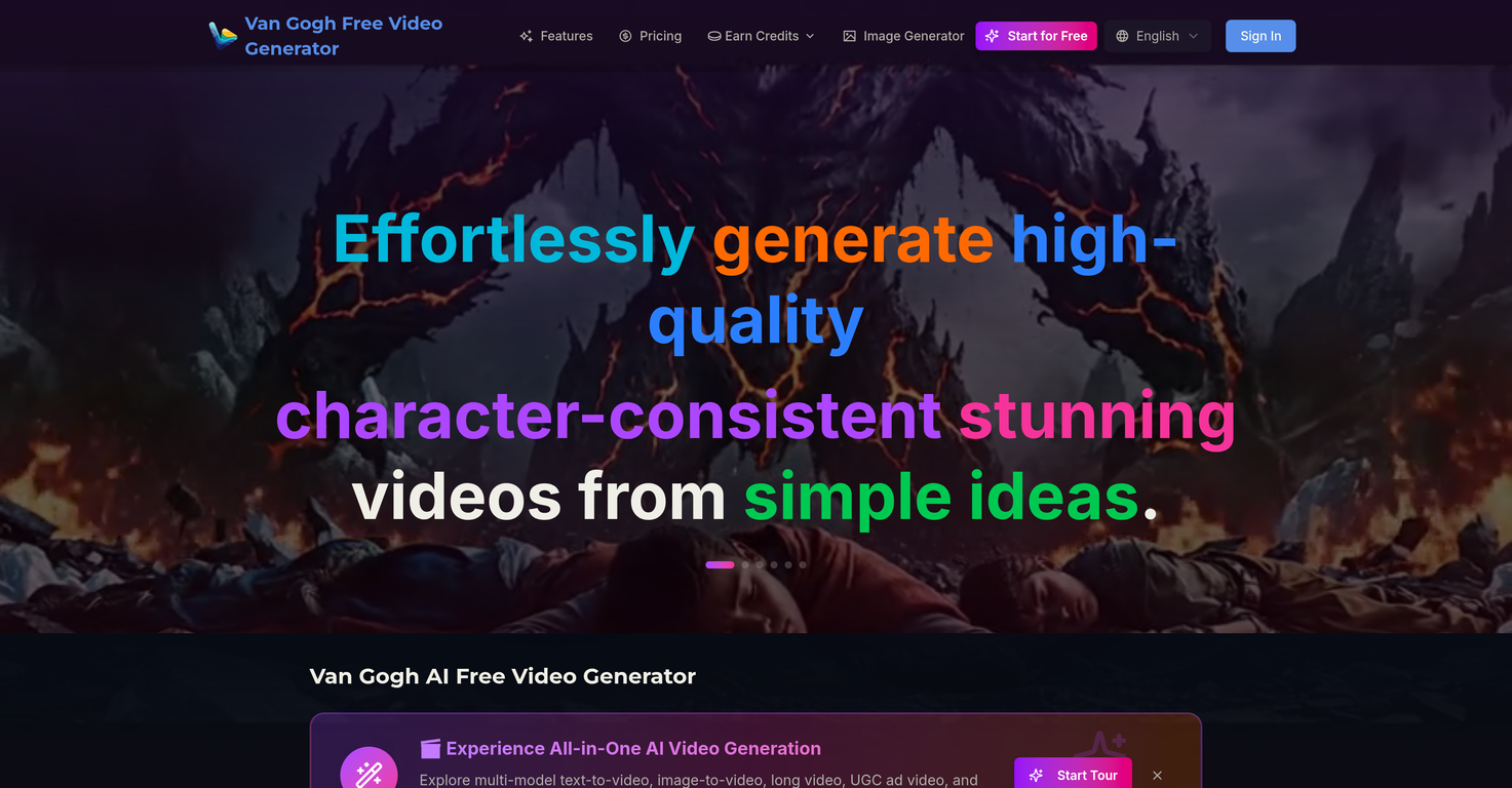 Van Gogh Free AI Video Generator is a versatile tool leveraging advanced artificial intelligence models to convert text or images into striking video artworks.