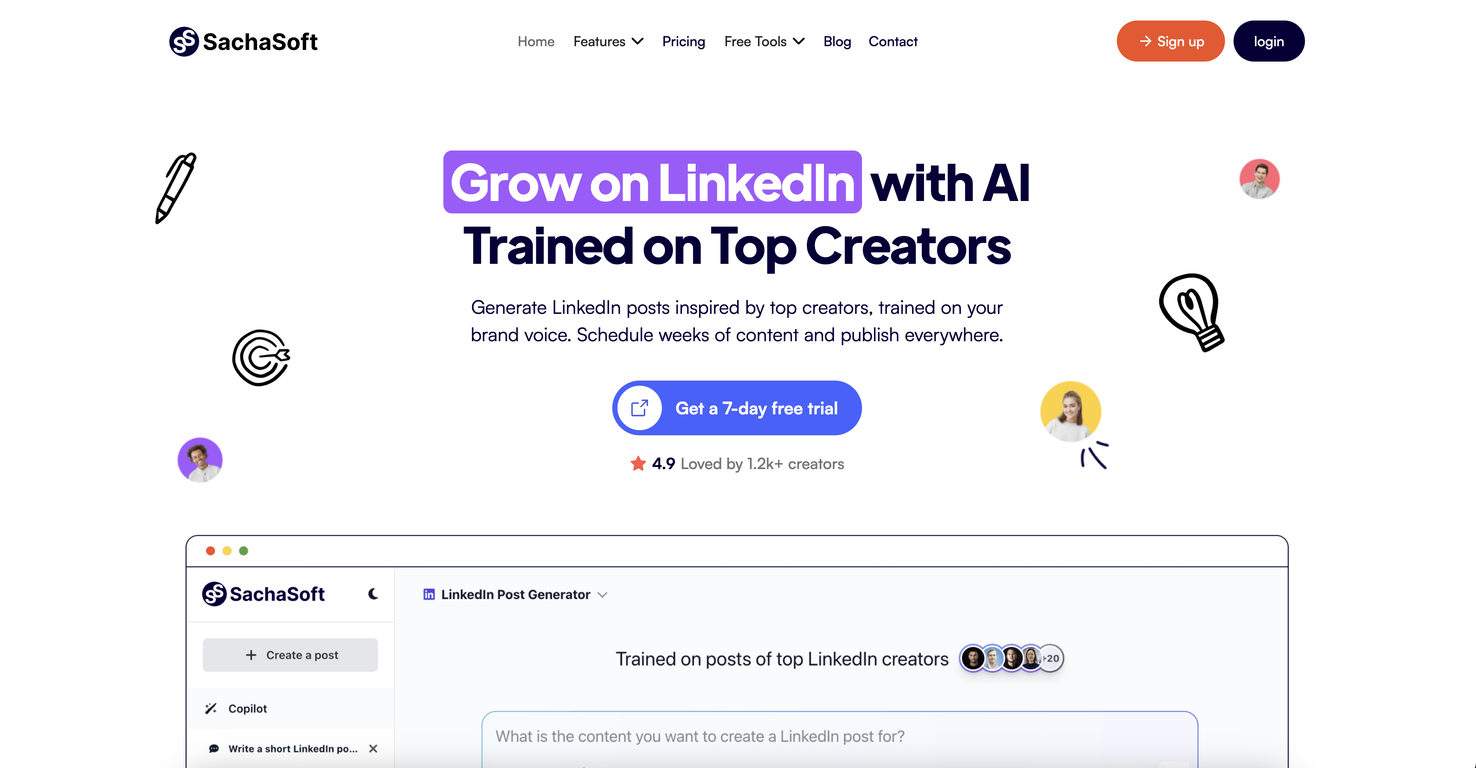 Moreover, it includes a carousel generator for creating engaging carousels. SachaSoft is unique because it's trained on popular posts from top creators in the field, enabling it to generate impressive, personalized content based on successful models.